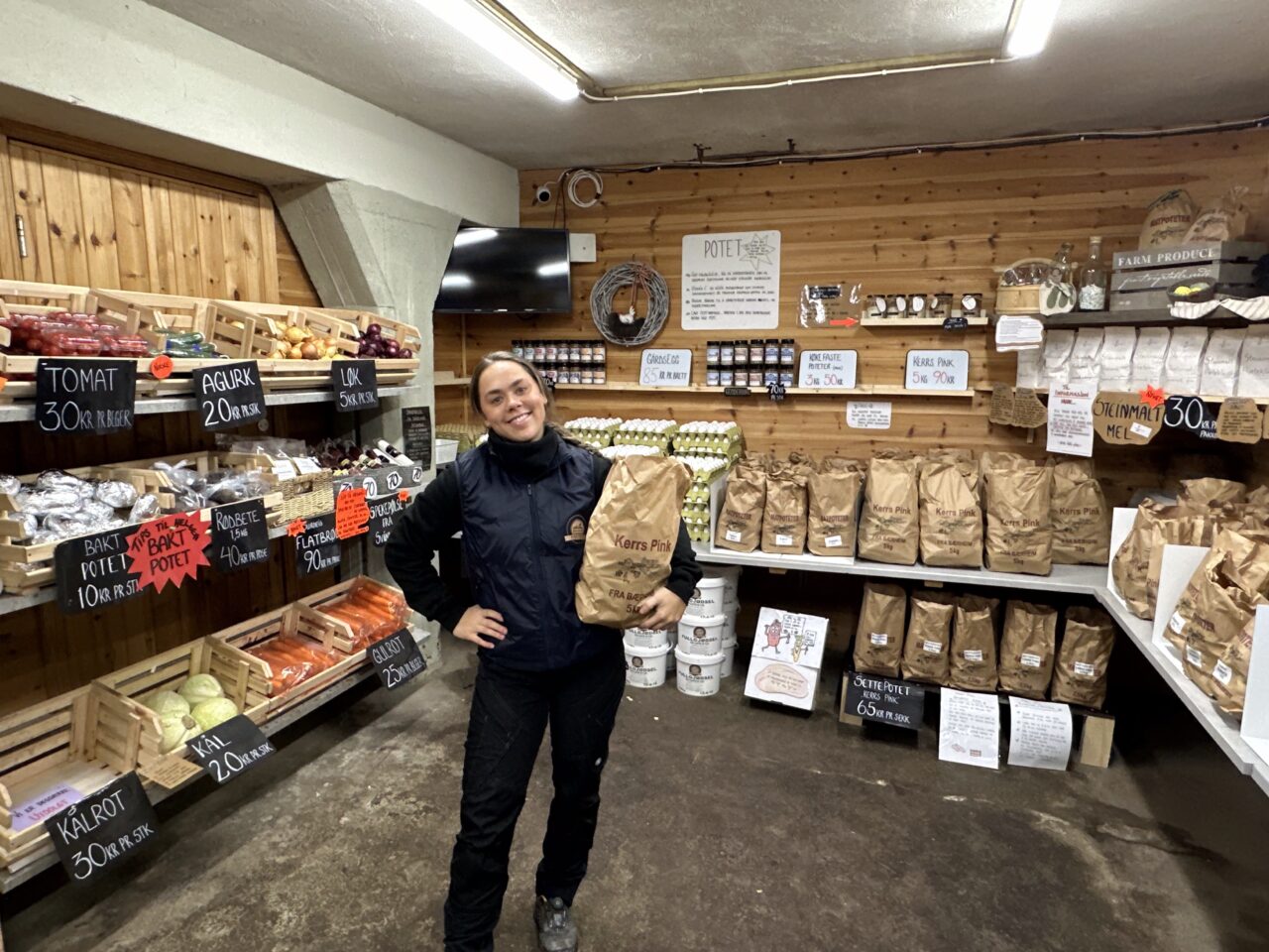 Salg av poteter, egg, grønnsaker, ost fra Ystepikene, produkter fra Jerseymeieriet.